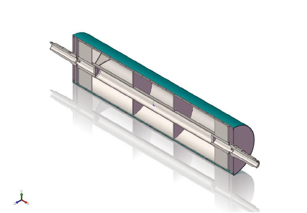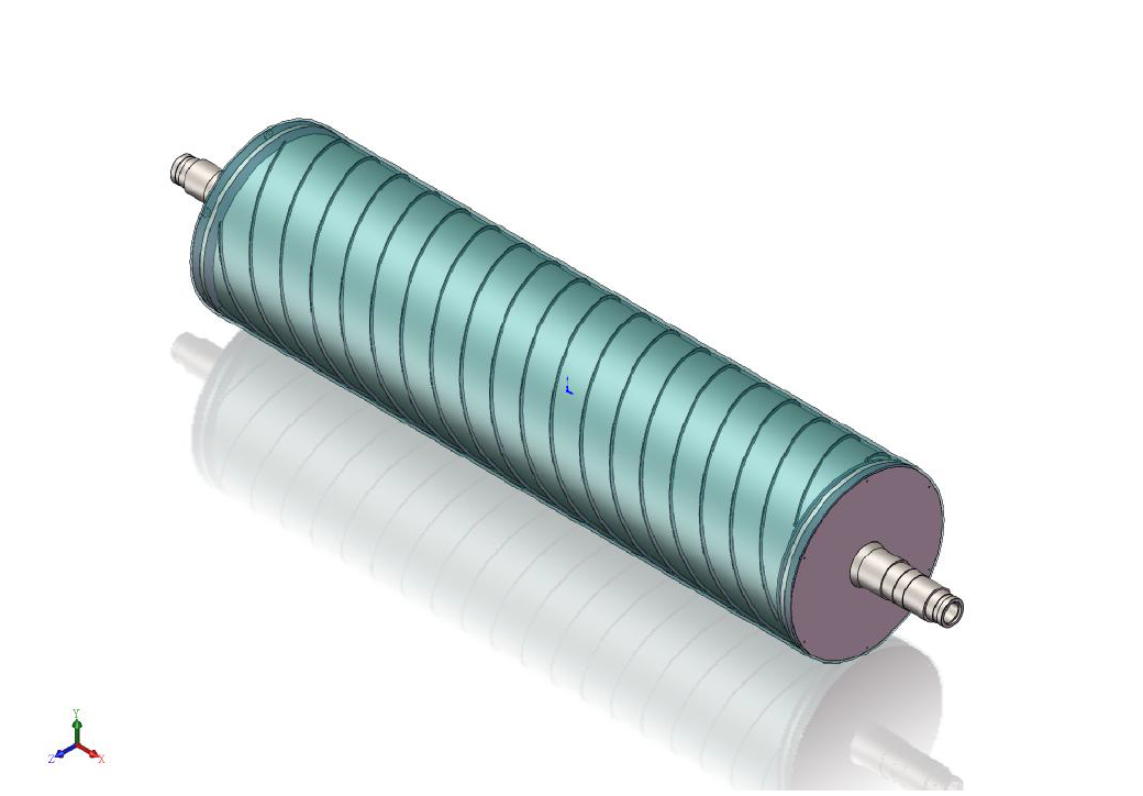 雙流道大直徑流延主冷輥,包括輥筒、進(jìn)水導(dǎo)流器、出水導(dǎo)流器,進(jìn)水軸頭管和出水軸頭管,輥筒包括外筒、與外筒同軸設(shè)置的內(nèi)筒和在外筒、內(nèi)筒之間設(shè)置的多個(gè)螺旋導(dǎo)流片,相鄰兩個(gè)螺旋導(dǎo)流片構(gòu)成一個(gè)螺旋導(dǎo)流槽,進(jìn)水導(dǎo)流器、出水導(dǎo)流器分別固定連接在輥筒的兩端,進(jìn)水軸頭管和出水軸頭管分別安裝在進(jìn)水導(dǎo)流器、出水導(dǎo)流器上。大直徑流延主冷輥,結(jié)構(gòu)簡單,由于設(shè)置了進(jìn)水導(dǎo)流器和出水導(dǎo)流器,可有效降低主冷輥內(nèi)部的流動(dòng)阻力,能夠使得流入輥筒內(nèi)的冷卻水量更加均勻,提高主冷輥的送水能力,提高主冷輥冷卻效率,有效提高輥筒表面的溫度均勻性,節(jié)約能耗。